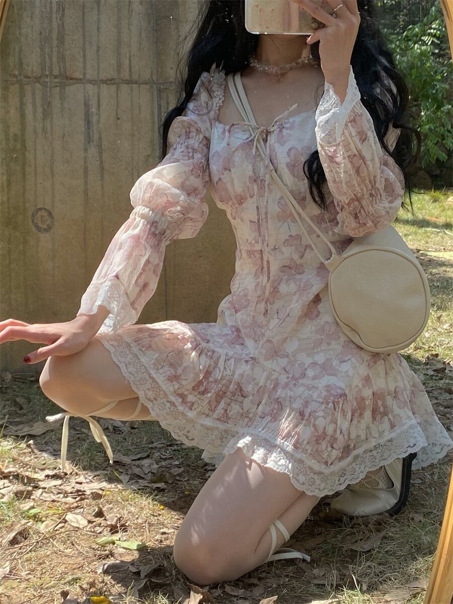 長袖レースフラワープリントレトロワンピース WWJULY55059976615