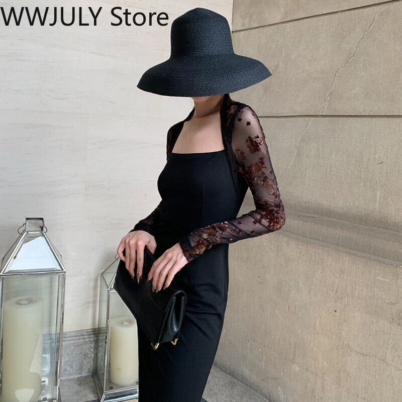 ロング ブラック レトロ 長袖 オータム 秋物 フラワーデザイン 会社 学校 通勤や通学にも アリエクWWJULYストア11610761215