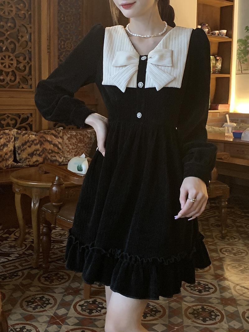 ロング ミニ ブラック リボン 長袖 スプリング 春物 ビンテージ アリエクWWJULYストア49159366519