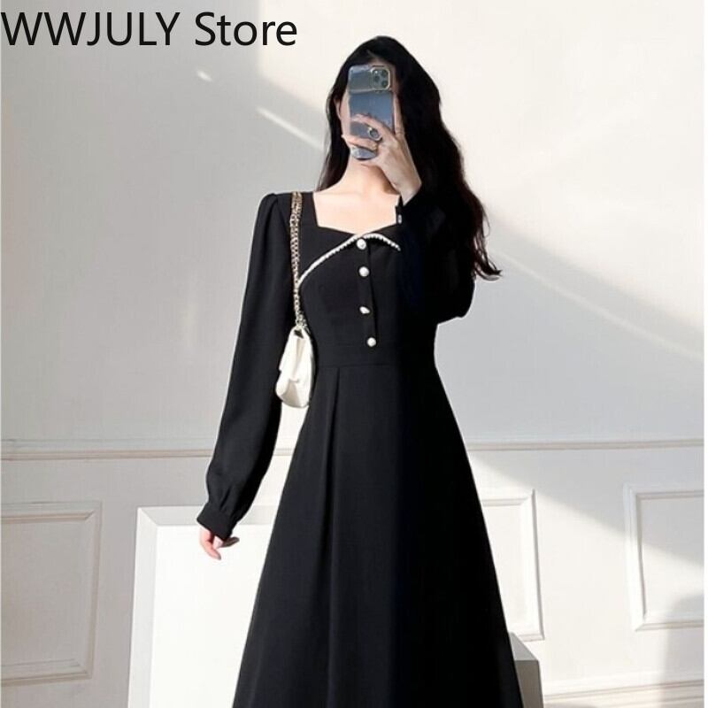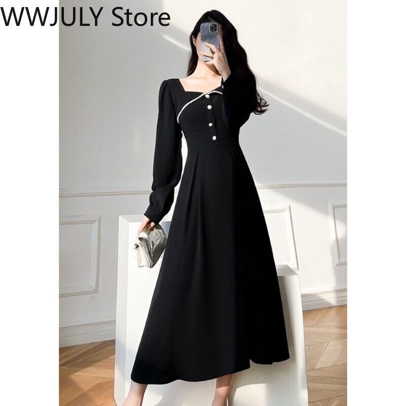 ロング ブラック 長袖 大人ガーリー スウィート キュート カジュアル オータム 秋物 ビンテージ 会社 学校 通勤や通学にも アリエクWWJULYストア39597484862