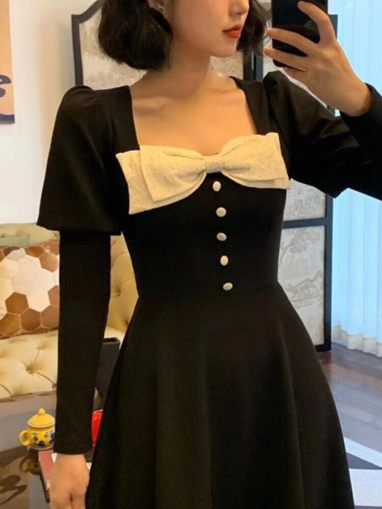ロング ブラック リボン 長袖 スプリング 春物 ビンテージ アリエクWWJULYストア85331551322