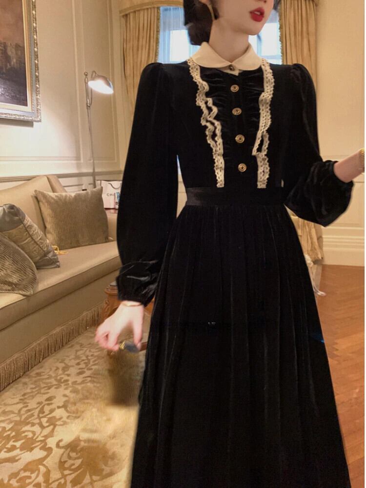 ロング ブラック レース 長袖 オータム 秋物 スリム ビンテージ アリエクWWJULYストア28452277625