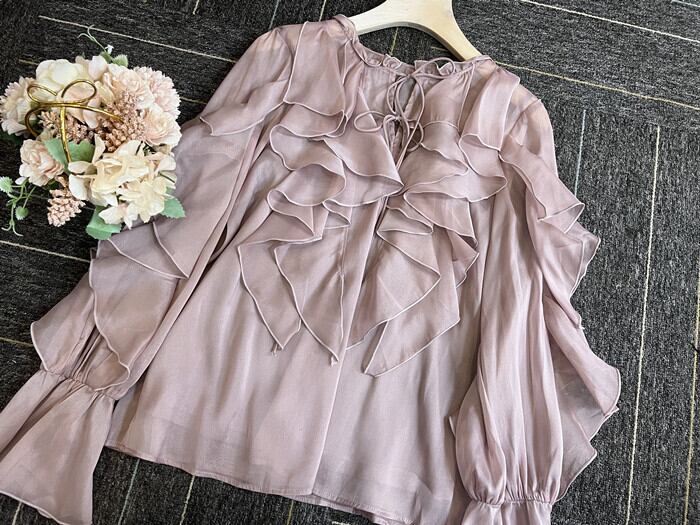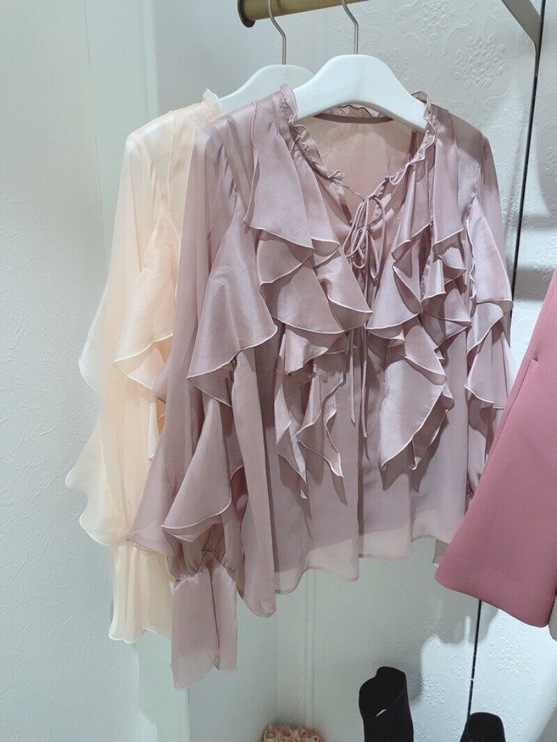 ピンク フレアスリーブ レース シャツ ブラウス 大人ガーリー スウィート キュート カジュアル オータム 秋物 Oネック レースアップ JPLS7533712966