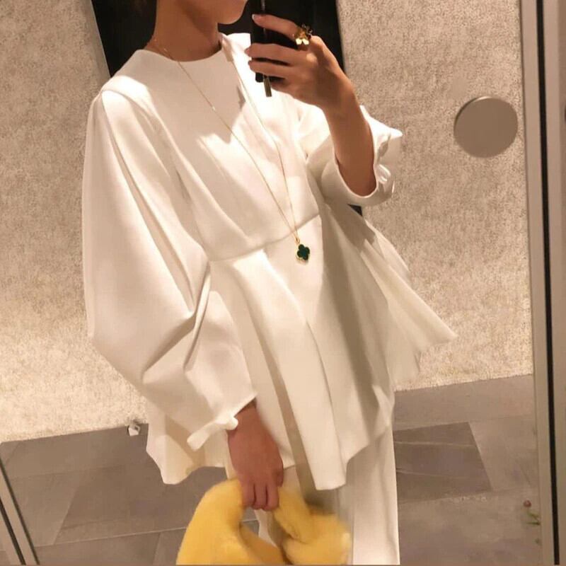 ロング ホワイト 長袖 ブラウス Oネック スリム ソリッドカラー JPLS195686971