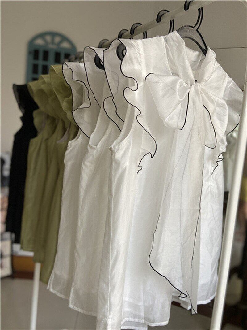 ショート シフォン リボン レース ブラウス 大人ガーリー スウィート キュート カジュアル サマー 夏物 レースアップ JPLS5473286137