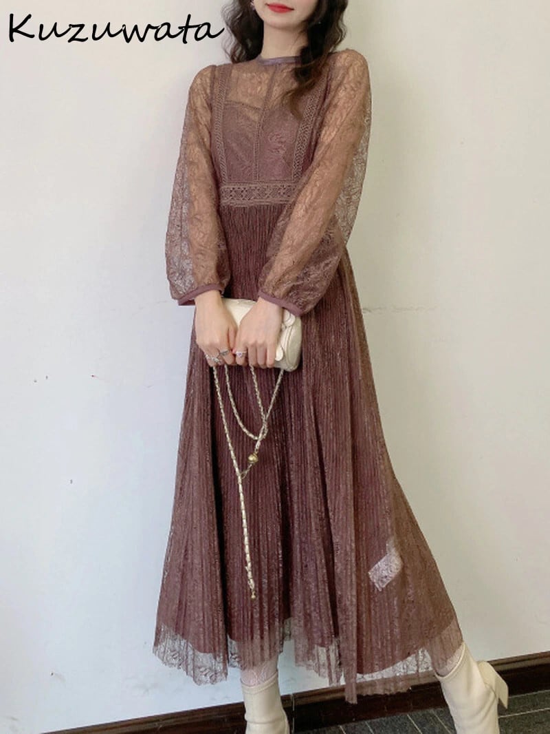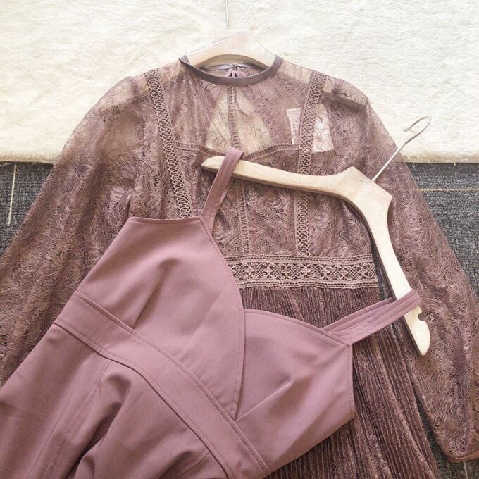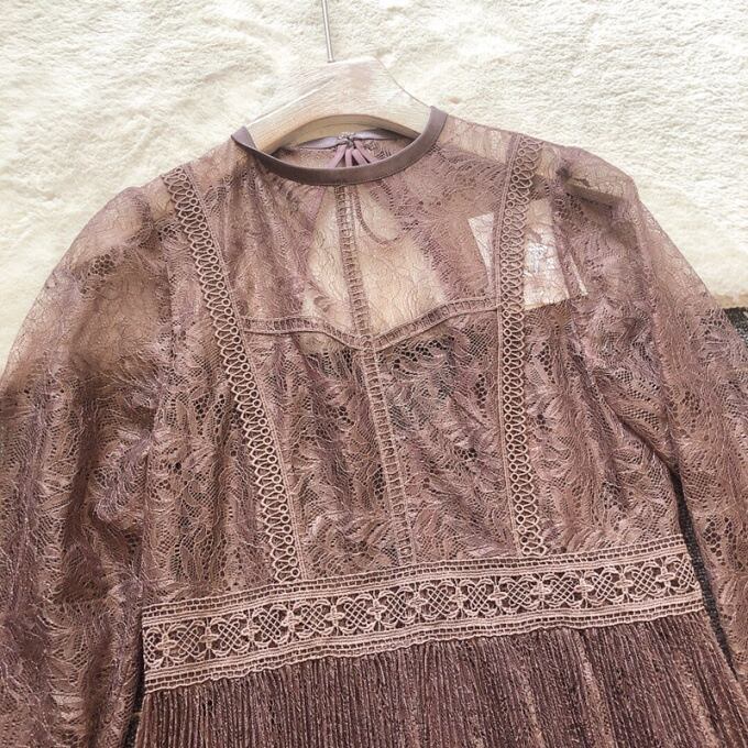 レース プリーツ オータム 秋物 ウィンター 冬物 ドレス Oネック スリム ソリッドカラー JPLS87415398869