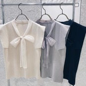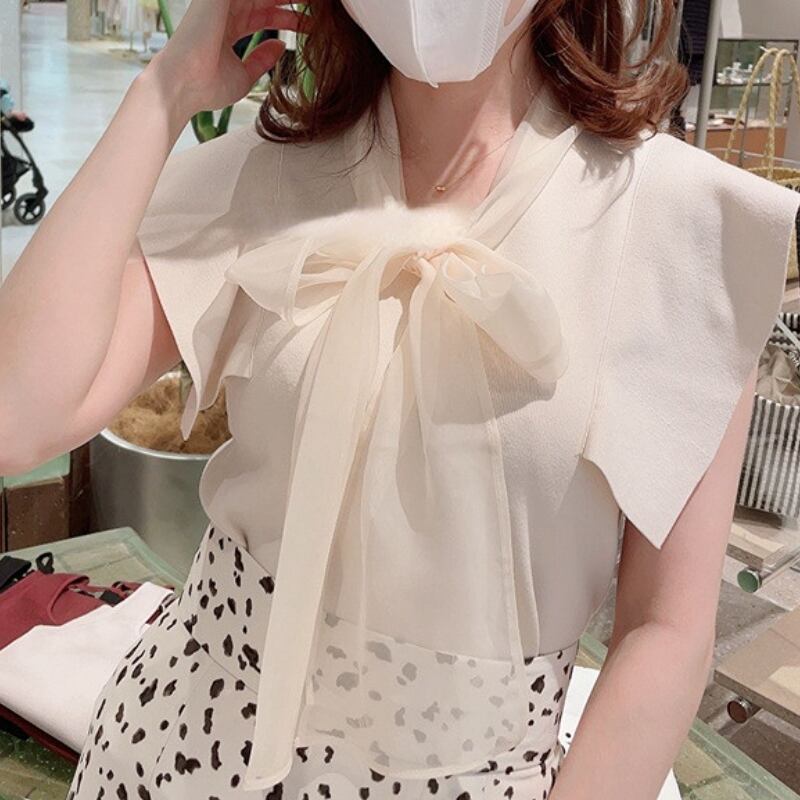 リボン レトロ 大人ガーリー スウィート キュート カジュアル スプリング 春物 ノースリーブ Vネック スリム ソリッドカラー JPLS34232107639