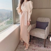 ロング レース プリーツ ドレス Vネック レースアップ JPLS2304427707