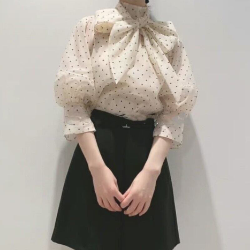 ランタンスリーブ シフォン リボン レース シャツ ブラウス スプリング 春物 レースアップ ビンテージ JPLS15701980360