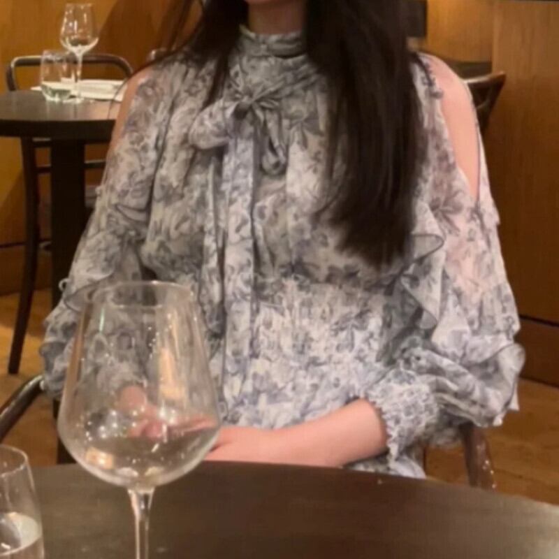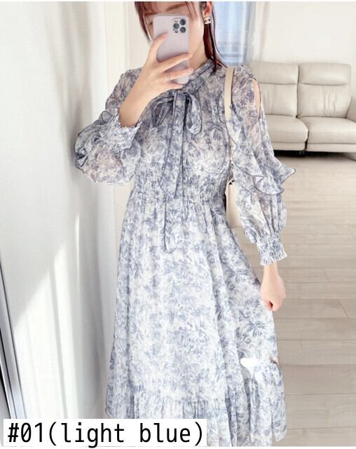 ランタンスリーブ シフォン レース プリント かわいい ドレス オフショルダー レースアップ JPLS36721241311