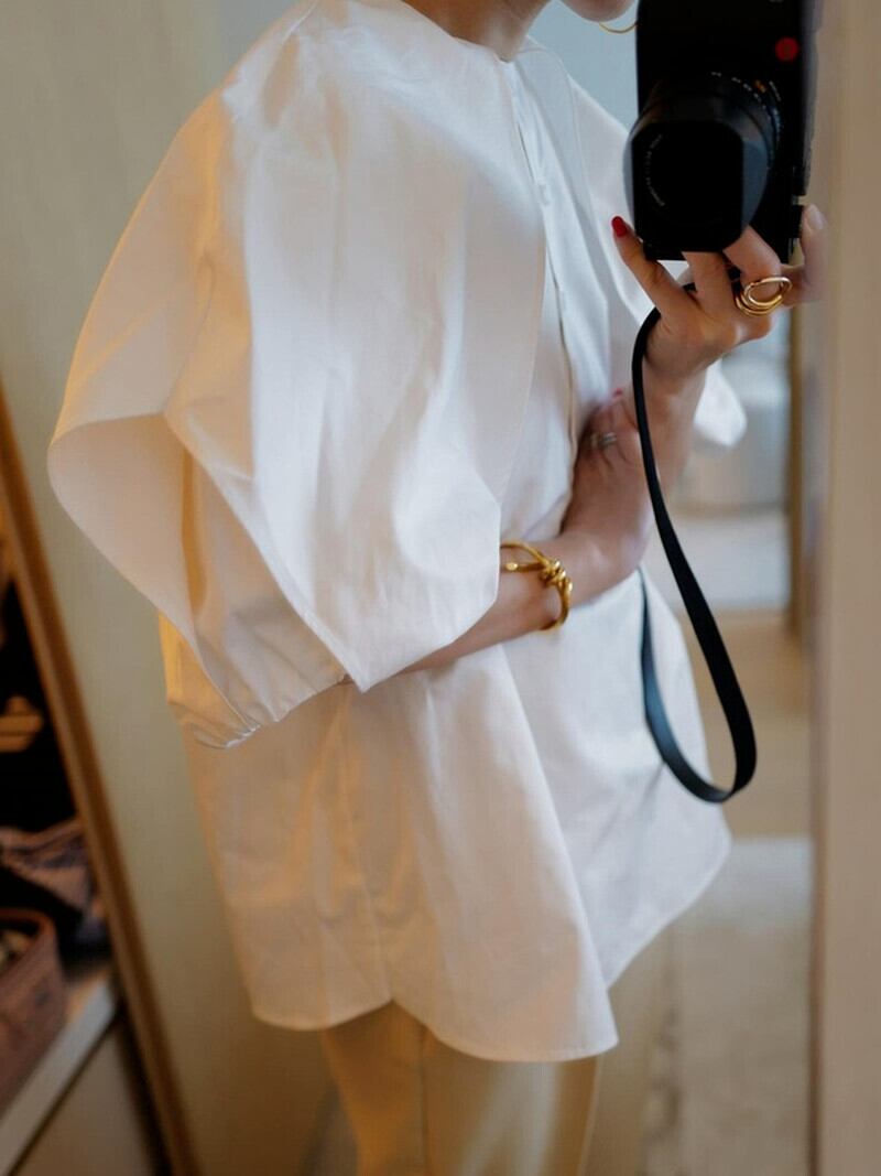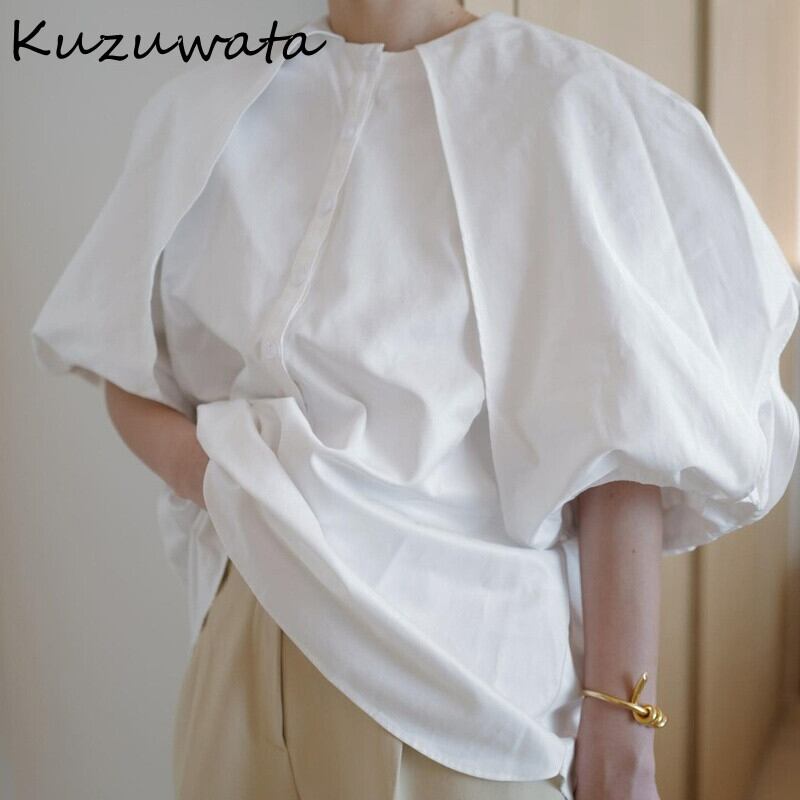 ホワイト ランタンスリーブ レトロ ブラウス サマー 夏物 Oネック JPLS73046326307