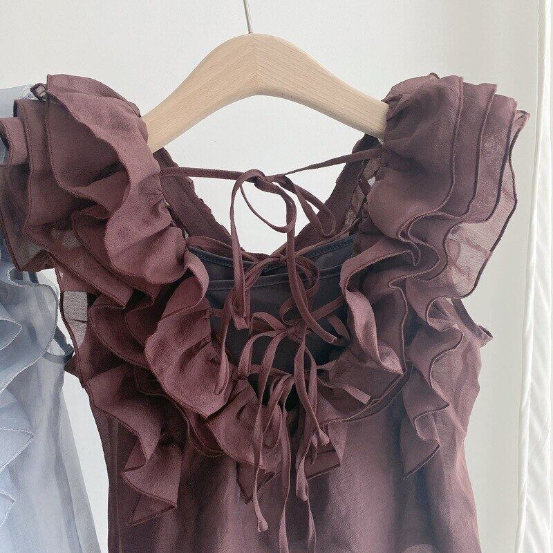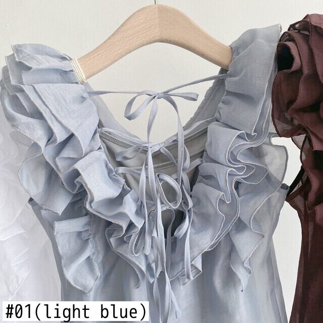 レース フリル ラッフル ブラウス サマー 夏物 ノースリーブ Vネック レースアップ ソリッドカラー JPLS19719282675