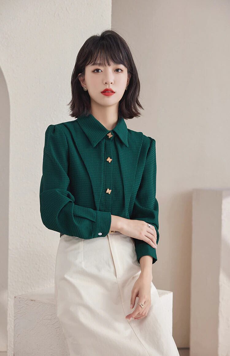 ロング シフォン 長袖 シャツ ブラウス オータム 秋物 グリーン ビンテージ 会社 学校 通勤や通学にも A-HHan31656130792