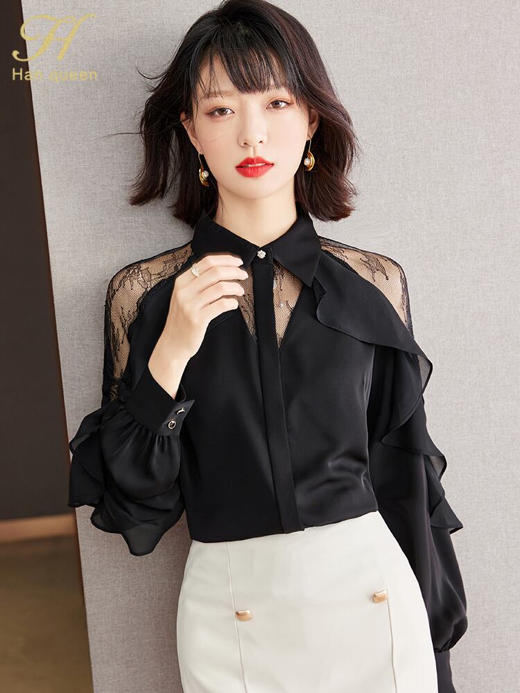 ブラック シフォン レース フリル ラッフル シャツ ブラウス オータム 秋物 ビンテージ 会社 学校 通勤や通学にも A-HHan9921489828