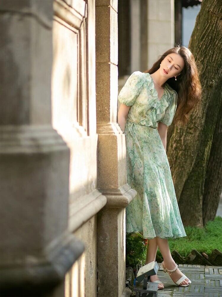 ランタンスリーブ サマー 夏物 ドレス Vネック Aライン ビンテージ A-HHan2929083864