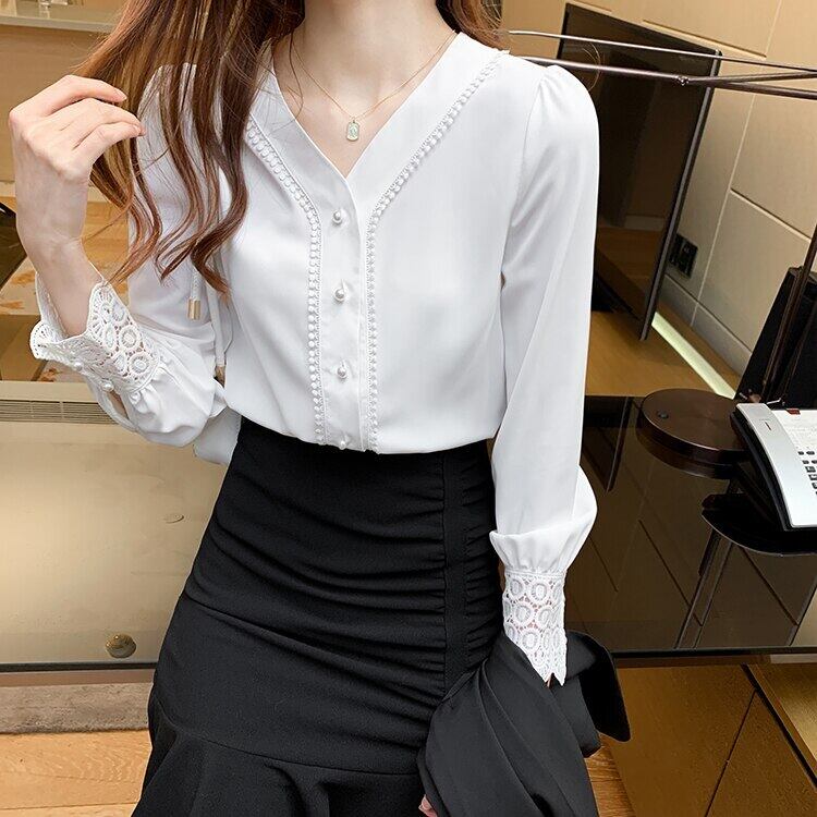 ホワイト シフォン シャツ ブラウス オータム 秋物 Vネック ビンテージ 会社 学校 通勤や通学にも A-HHan7858652565
