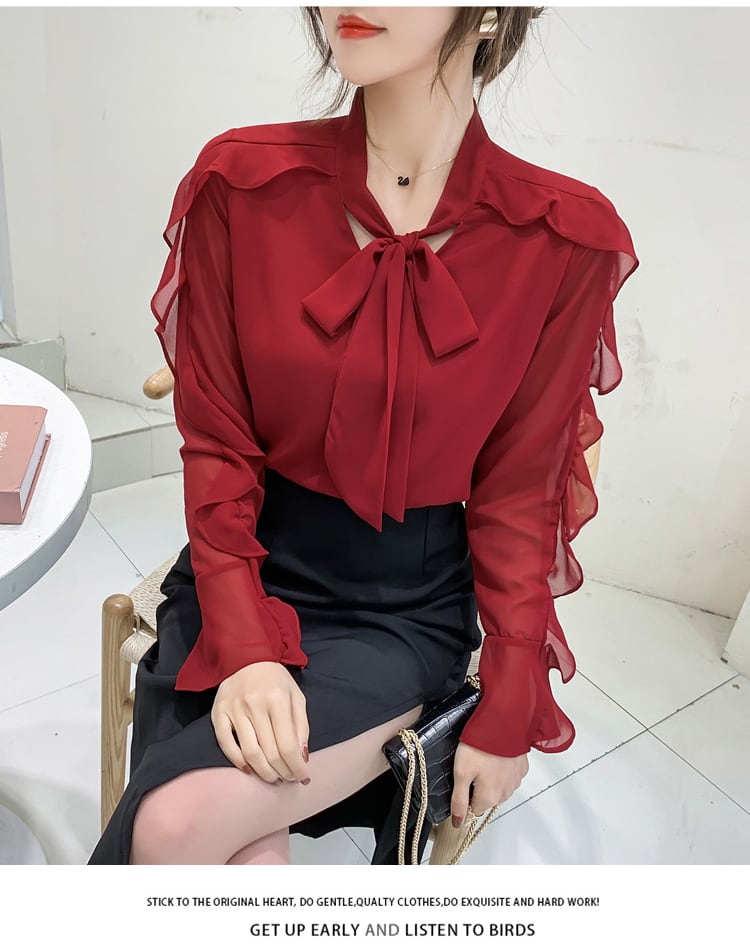 シフォン リボン レース フリル ラッフル ブラウス スプリング 春物 レースアップ ビンテージ 会社 学校 通勤や通学にも A-HHan97877252315