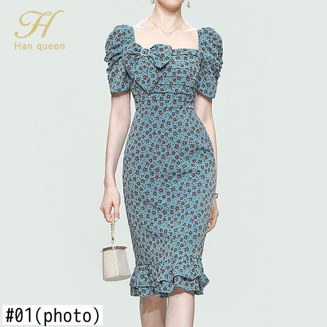 リボン フリル ラッフル サマー 夏物 ドレス 花柄 スリム 会社 学校 通勤や通学にも A-HHan32789055735