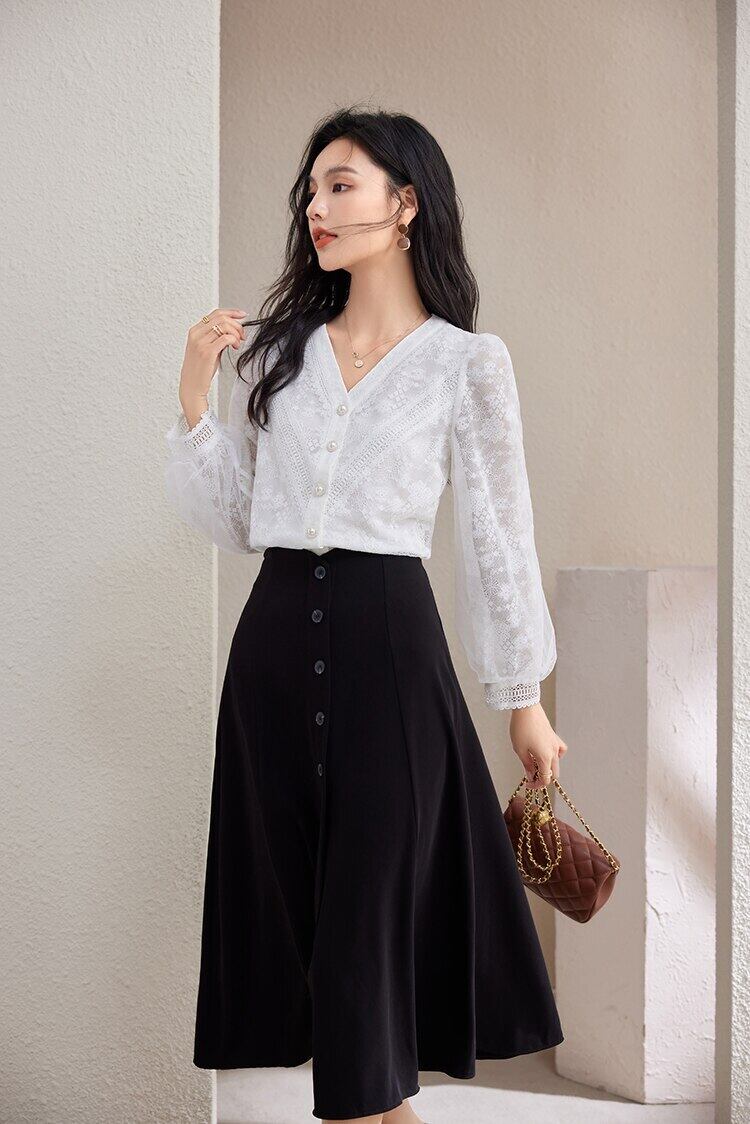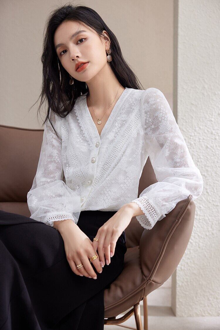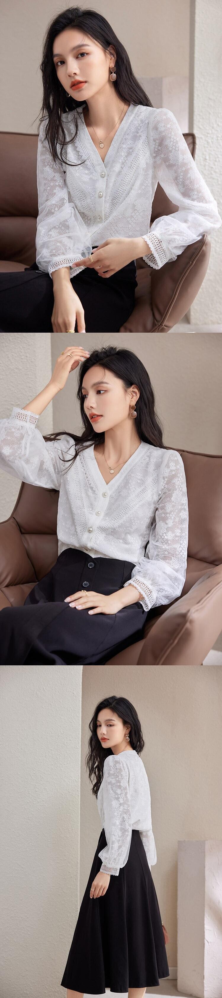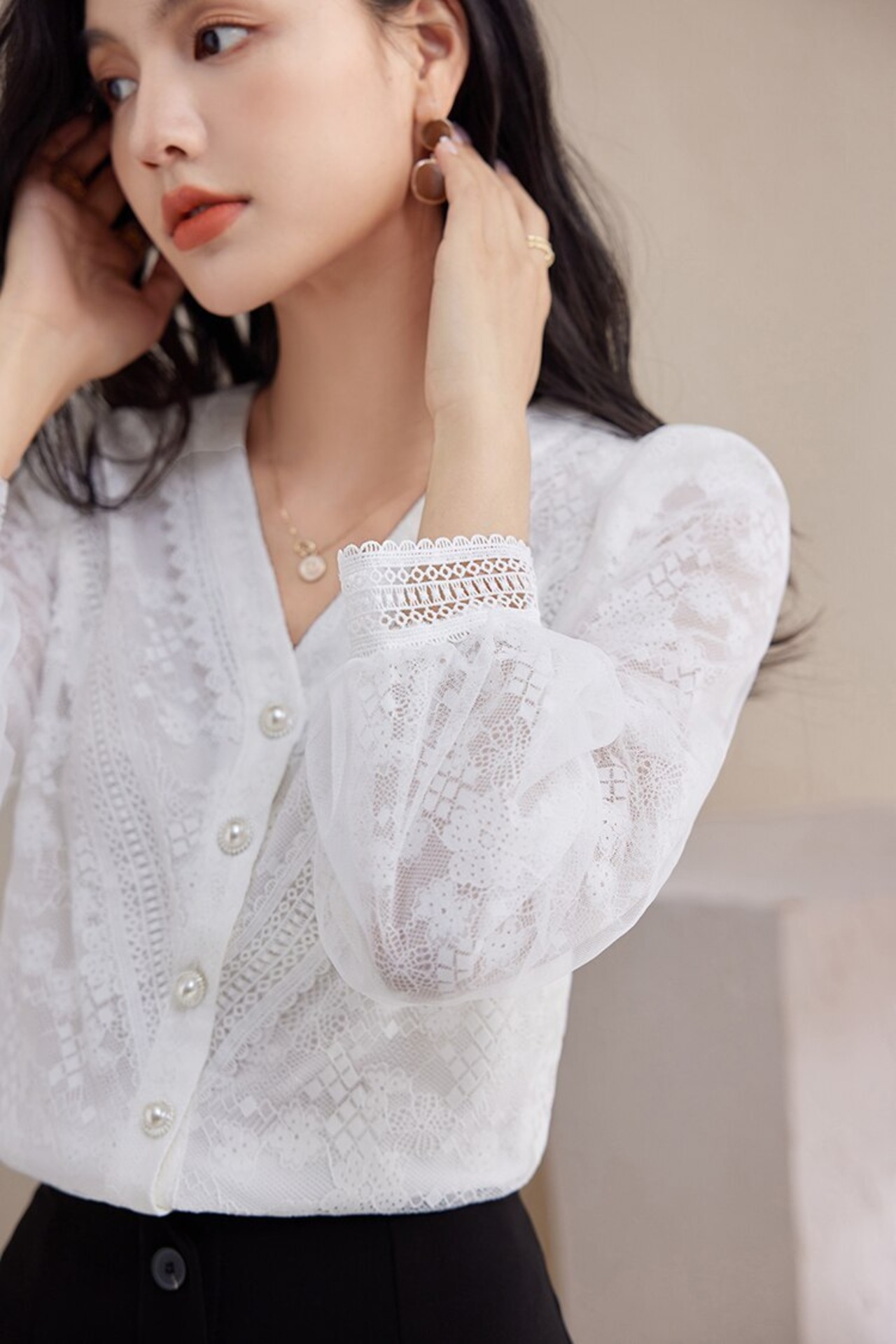 ホワイト ランタンスリーブ レース ブラウス オータム 秋物 Vネック ビンテージ 会社 学校 通勤や通学にも A-HHan96030381906