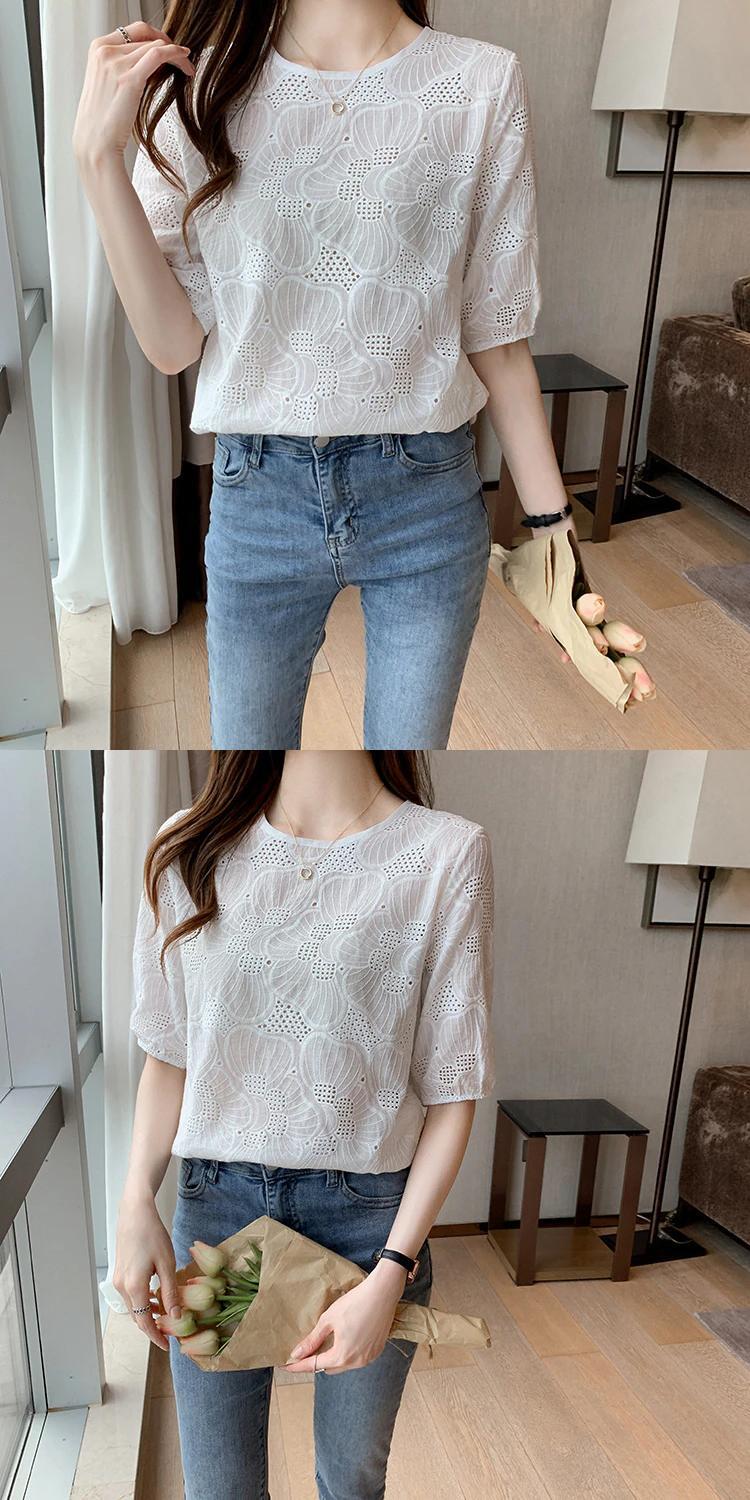 レッド コットン ブラウス 刺繍 サマー 夏物 Oネック ビンテージ A-HHan45617711576