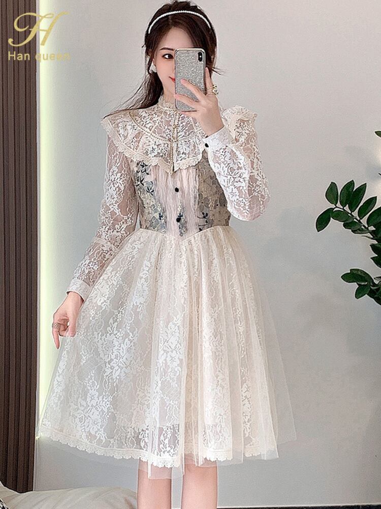 レトロ レース スプリング 春物 メッシュ ドレス Aライン スリム 会社 学校 通勤や通学にも A-HHan32113003409
