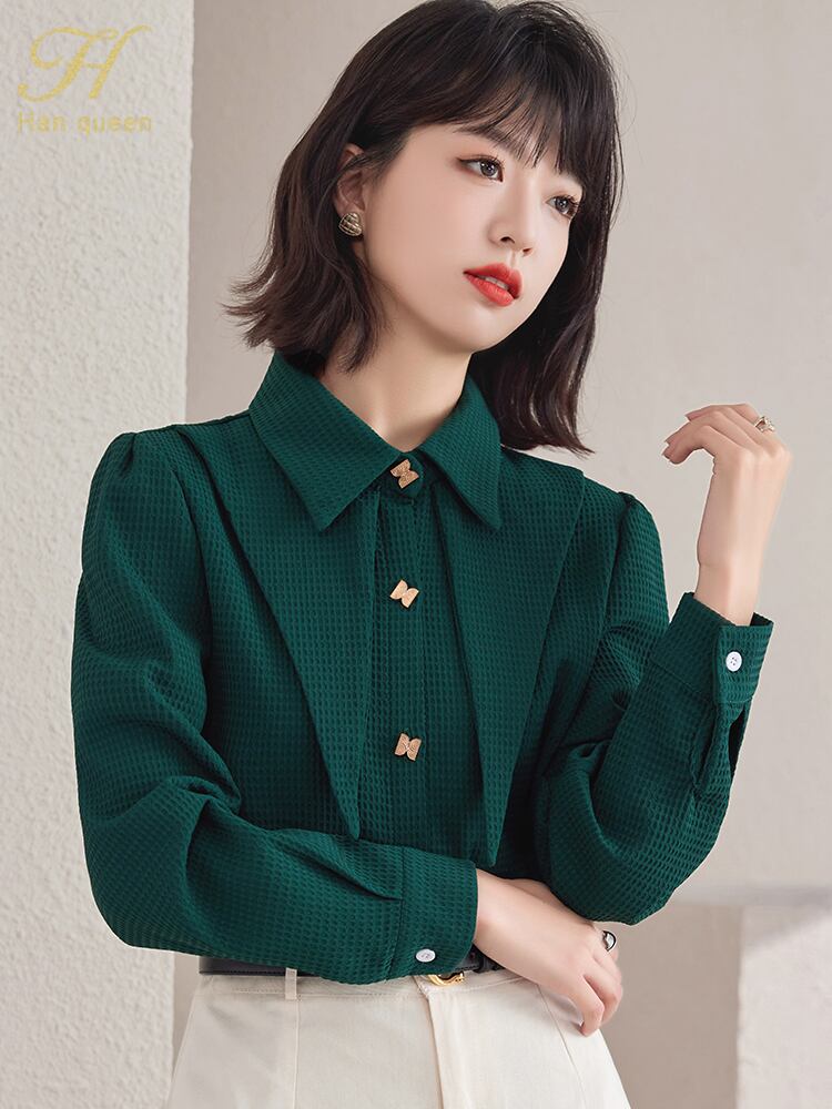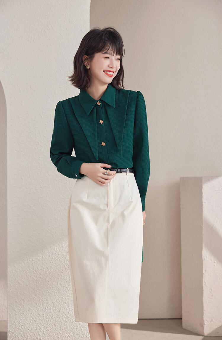 ロング シフォン 長袖 シャツ ブラウス スプリング 春物 オータム 秋物 グリーン ビンテージ 会社 学校 通勤や通学にも A-HHan3576549501