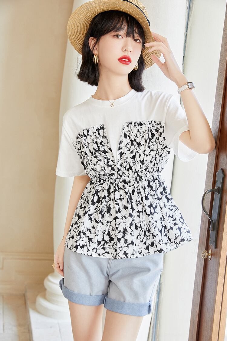 ショート シフォン 半袖 ハーフスリーブ シャツ ブラウス サマー 夏物 フラワーデザイン ビンテージ 会社 学校 通勤や通学にも A-HHan74870267239