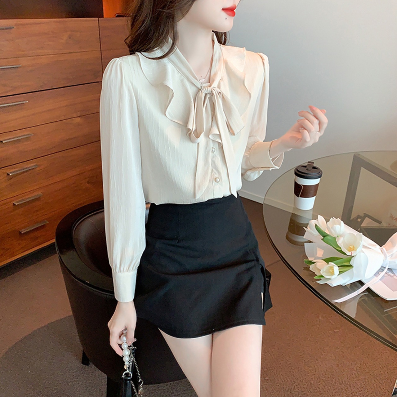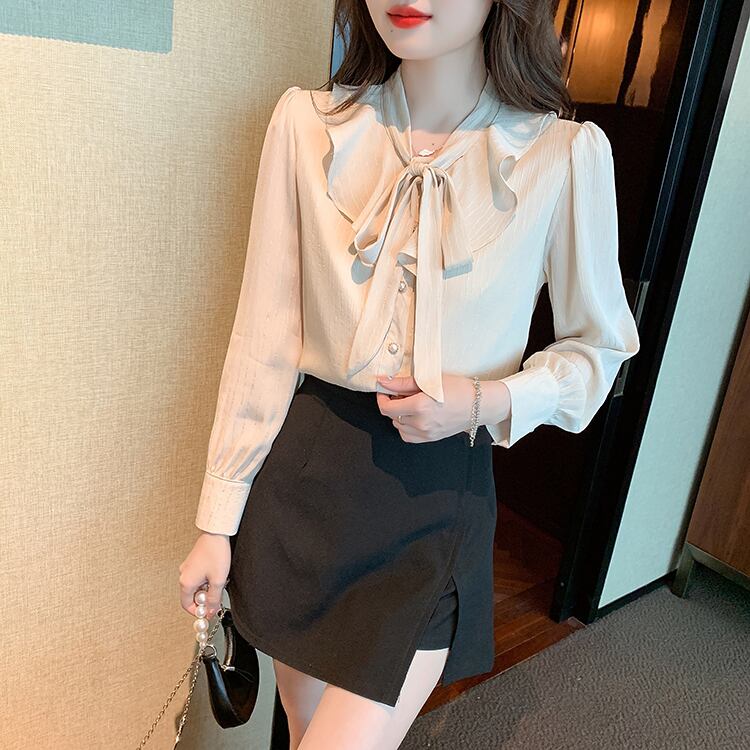 ロング シフォン リボン レース 長袖 フリル ラッフル シャツ ブラウス レースアップ ビンテージ 会社 学校 通勤や通学にも A-HHan88991893490