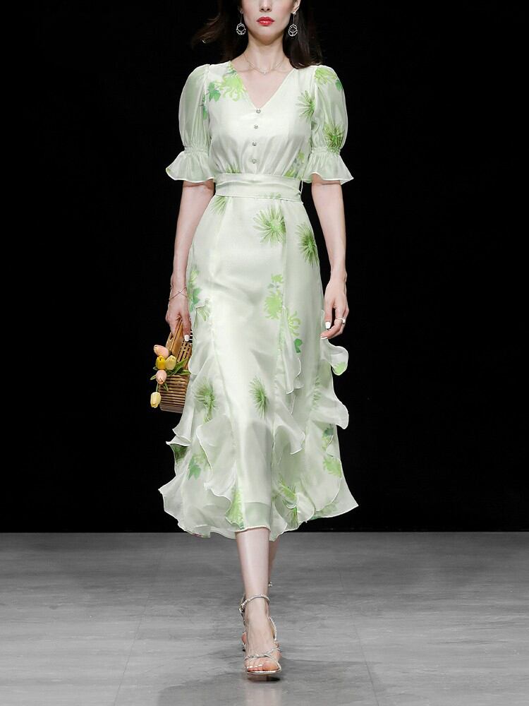 ショート 半袖 ハーフスリーブ プリント サマー 夏物 ドレス Vネック Aライン 会社 学校 通勤や通学にも A-HHan36876850864