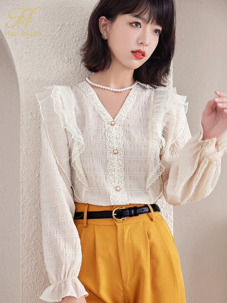 シフォン フリル ラッフル シャツ ブラウス スプリング 春物 Vネック ビンテージ 会社 学校 通勤や通学にも A-HHan96590138893