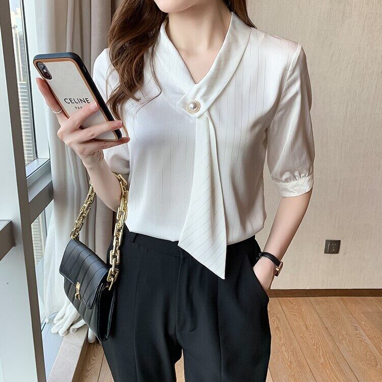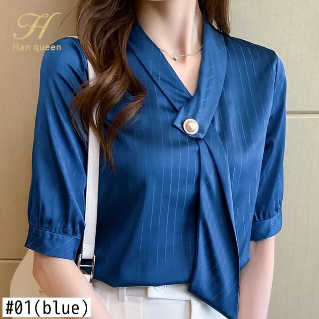 ショート シフォン 半袖 ハーフスリーブ シャツ ブラウス サマー 夏物 Vネック ストライプ ビンテージ 会社 学校 通勤や通学にも A-HHan48528208909