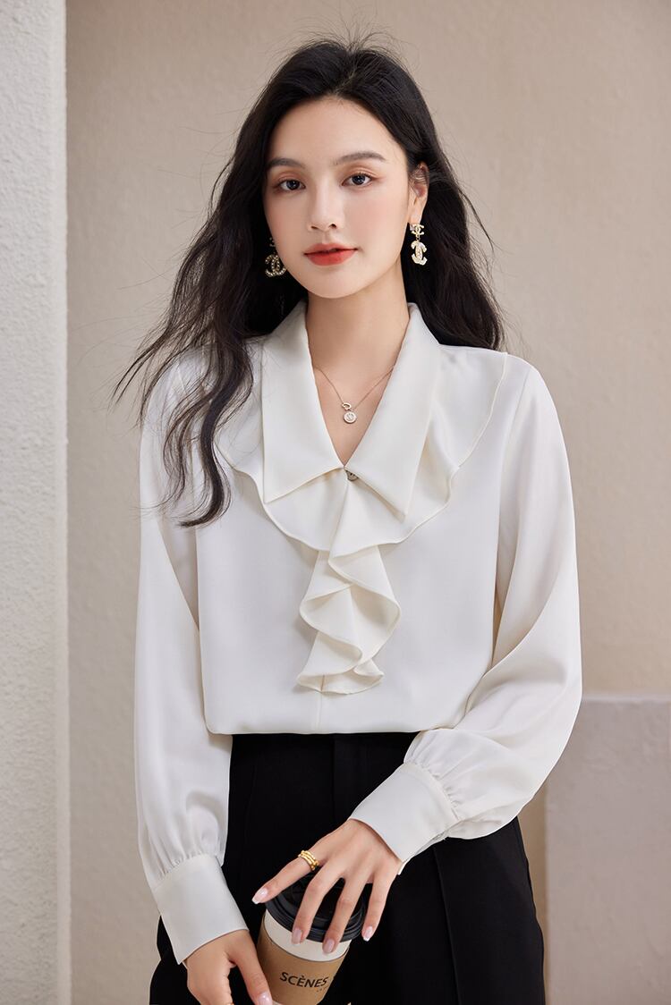 ロング シフォン 長袖 フリル ラッフル シャツ ブラウス オータム 秋物 サテン 会社 学校 通勤や通学にも A-HHan38515497049