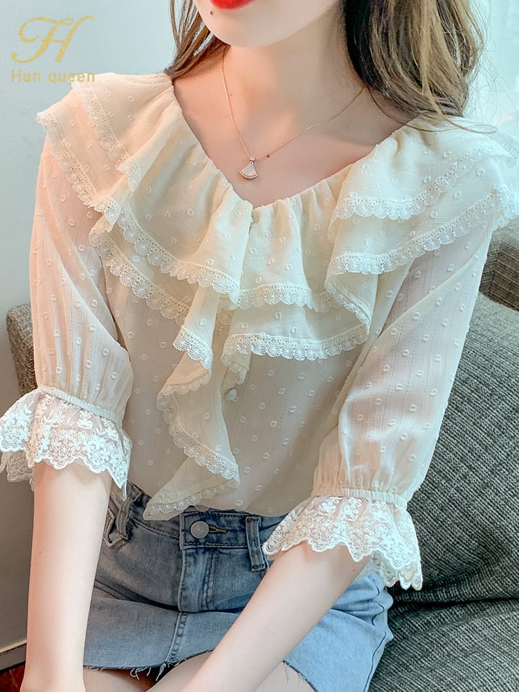 フレアスリーブ シフォン フリル ラッフル シャツ ブラウス Vネック ビンテージ 会社 学校 通勤や通学にも A-HHan59515712217
