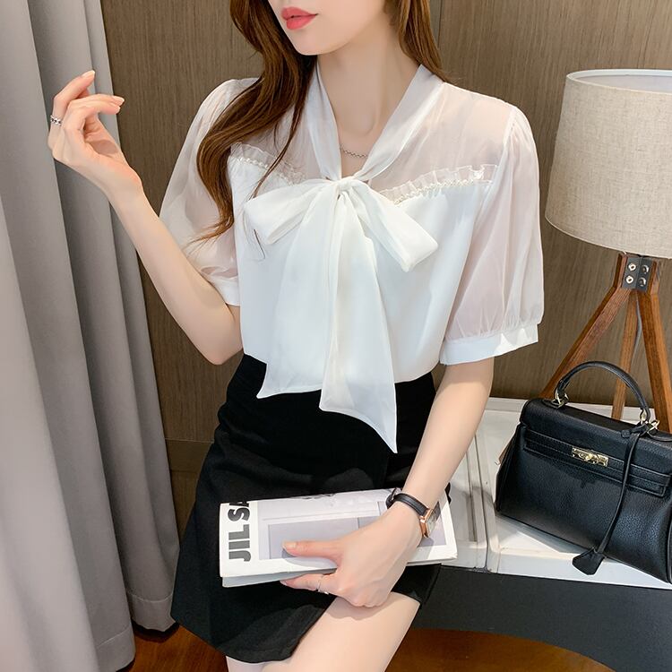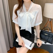 ショート シフォン リボン レース 半袖 ハーフスリーブ シャツ ブラウス サマー 夏物 レースアップ ビンテージ A-HHan84014750227
