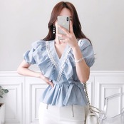 シフォン フリル ラッフル カジュアル エレガント Vネック ソリッドカラー 会社 学校 通勤や通学にも MingJieBiHuo46671415146
