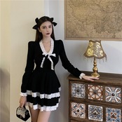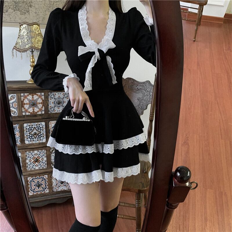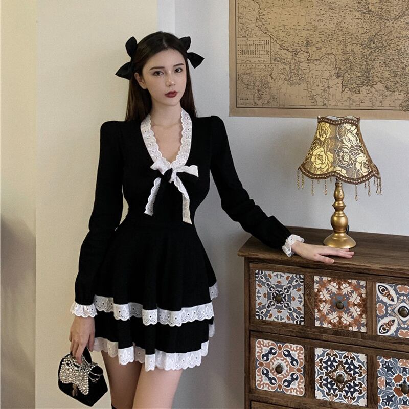 ミニ ブラック リボン レース オータム 秋物 ウィンター 冬物 Vネック スリム ビンテージ WWJULY35495998785