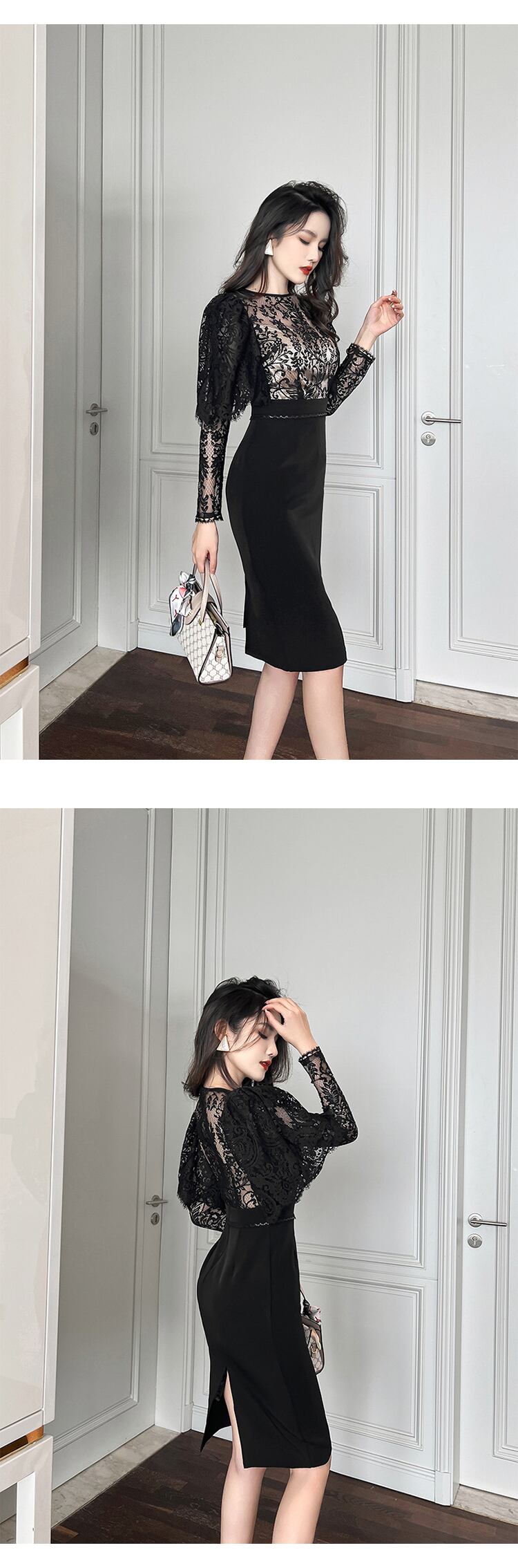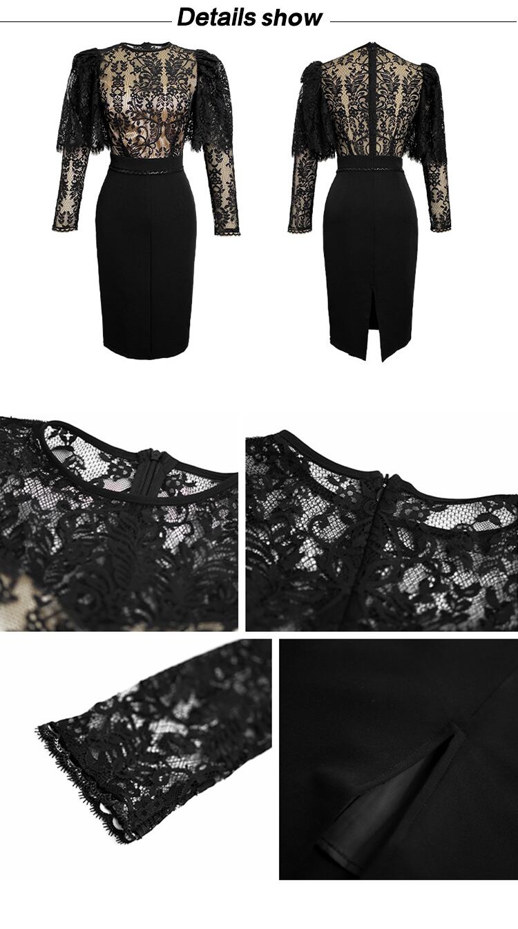 ロング ブラック レース 長袖 刺繍 花柄 スリム MingJieBiHuo82876930532