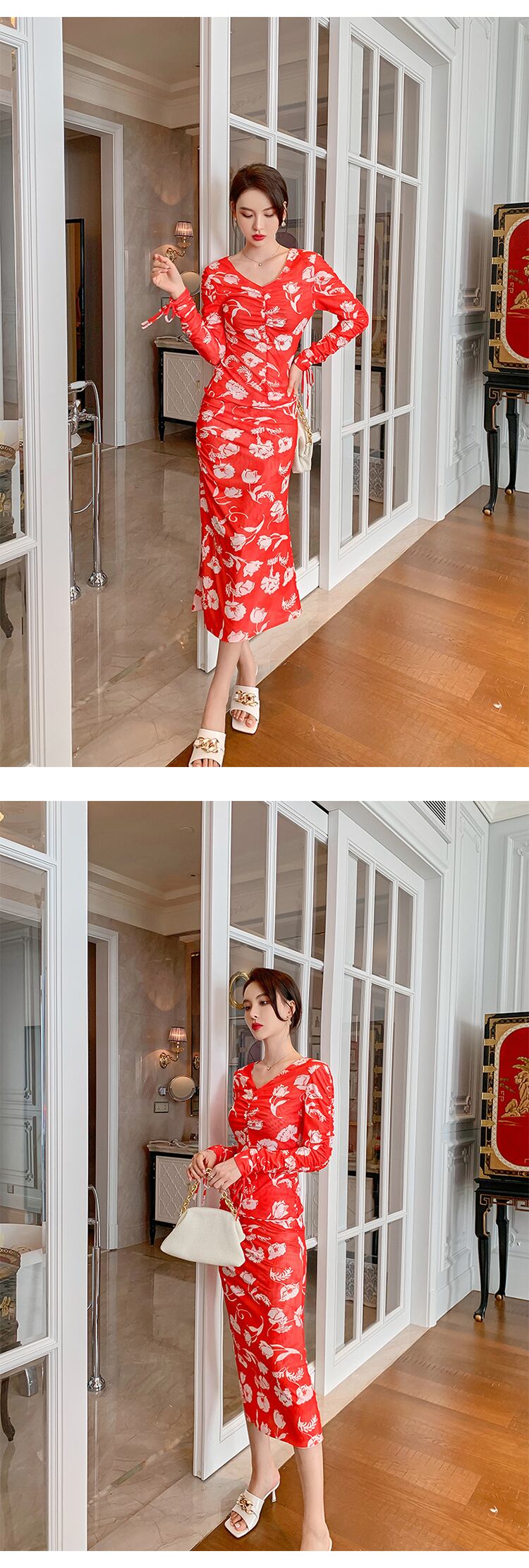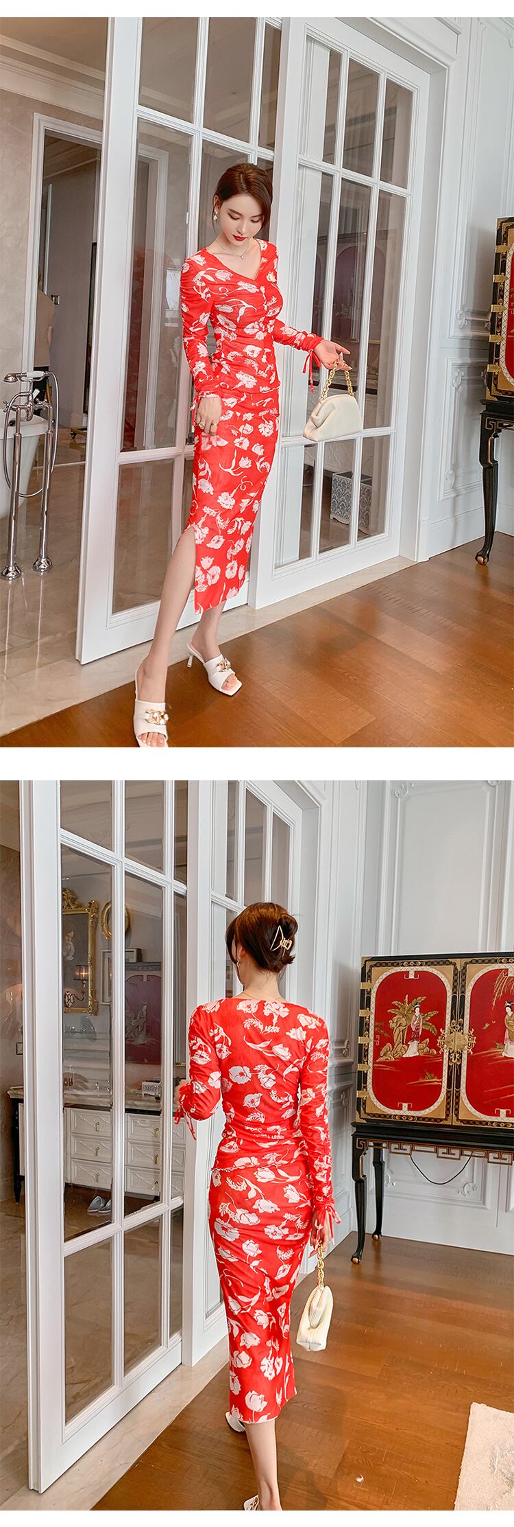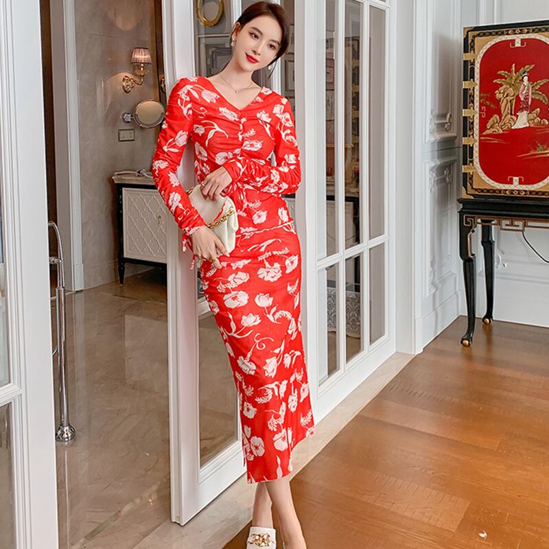 ロング 長袖 ブラウス 花柄 スカート Vネック MingJieBiHuo43138515520