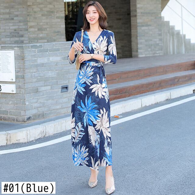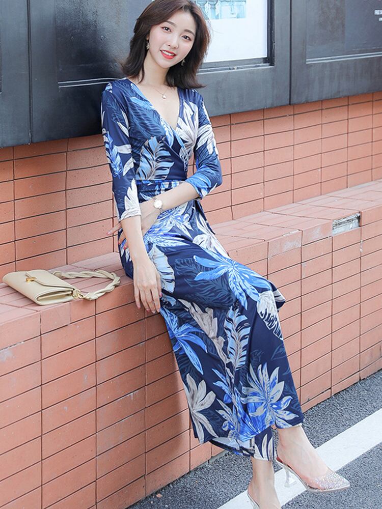 ロング エレガント ビーチ 花柄 Vネック Aライン スリム MingJieBiHuo29635141022
