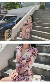 ロング ピンク 大人ガーリー スウィート キュート カジュアル スプリング 春物 ビーチ Vネック スリム フラワーデザイン MingJieBiHuo28837121751