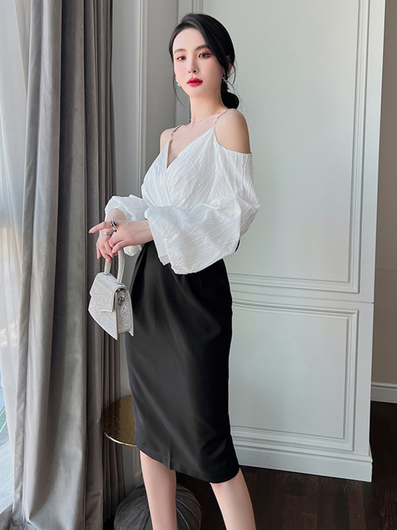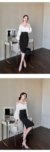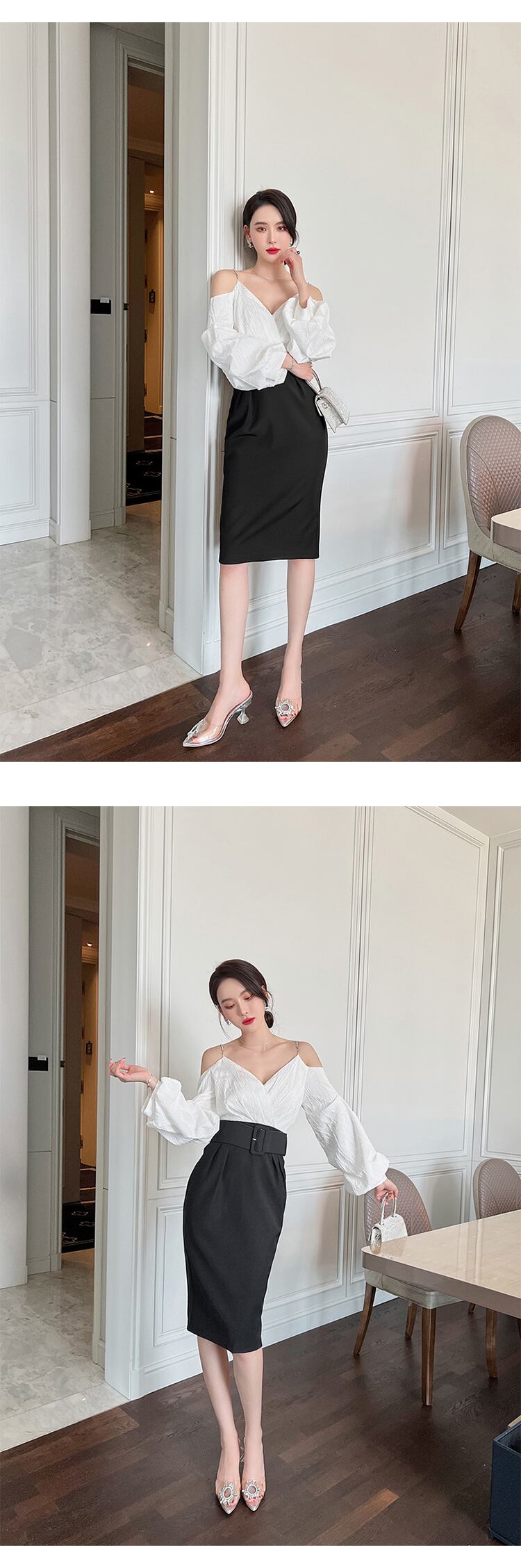 ランタンスリーブ スプリング 春物 ドレス ハーネス ベルト Vネック オフショルダー 会社 学校 通勤や通学にも MingJieBiHuo97974802369