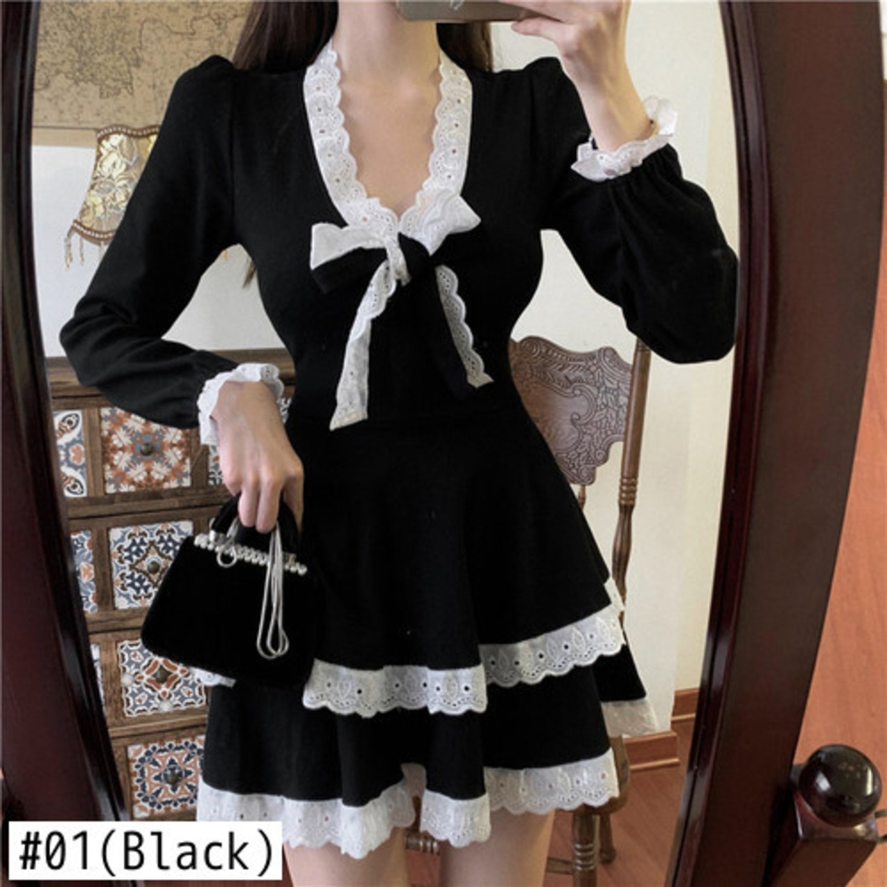 ミニ ブラック リボン レース オータム 秋物 ウィンター 冬物 Vネック スリム ビンテージ WWJULY14120443427