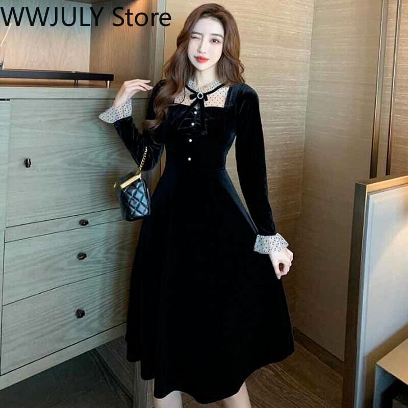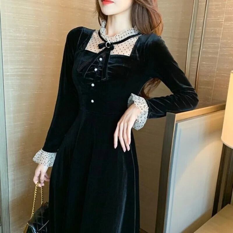 ロング ブラック リボン レース 長袖 ウィンター 冬物 レースアップ 会社 学校 通勤や通学にも WWJULY27689582335