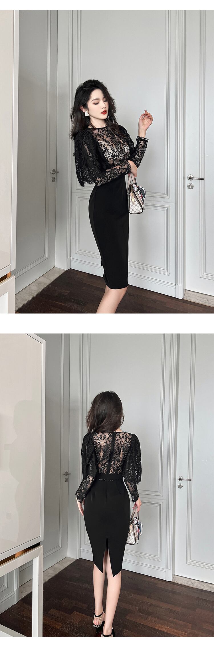 ロング ブラック レース 長袖 刺繍 花柄 スリム MingJieBiHuo50927477442