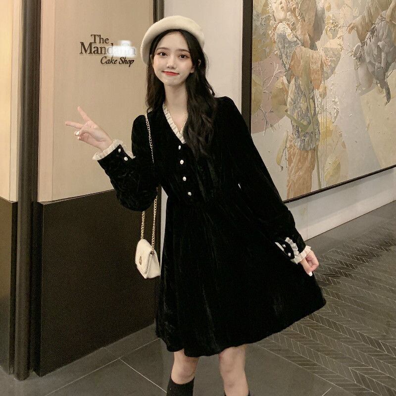 ロング ブラック レース 長袖 オータム 秋物 Vネック ソリッドカラー ビンテージ 会社 学校 通勤や通学にも WWJULY51639857196