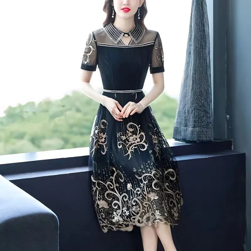 ショート ロング ブラック レース 半袖 ハーフスリーブ 刺繍 サマー 夏物 ドレス スリム WCH79897670034