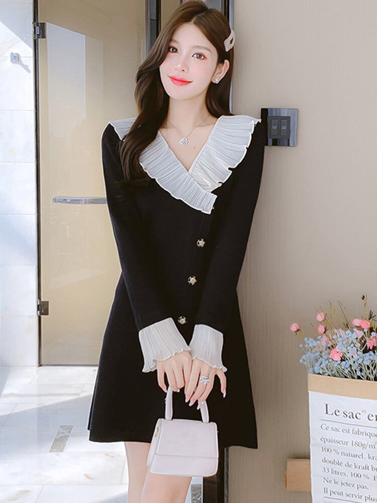ミニ ブラック ストリート 大人ガーリー スウィート キュート カジュアル オータム 秋物 ウィンター 冬物 ドレス Vネック スリム MingJieBiHuo92052140470