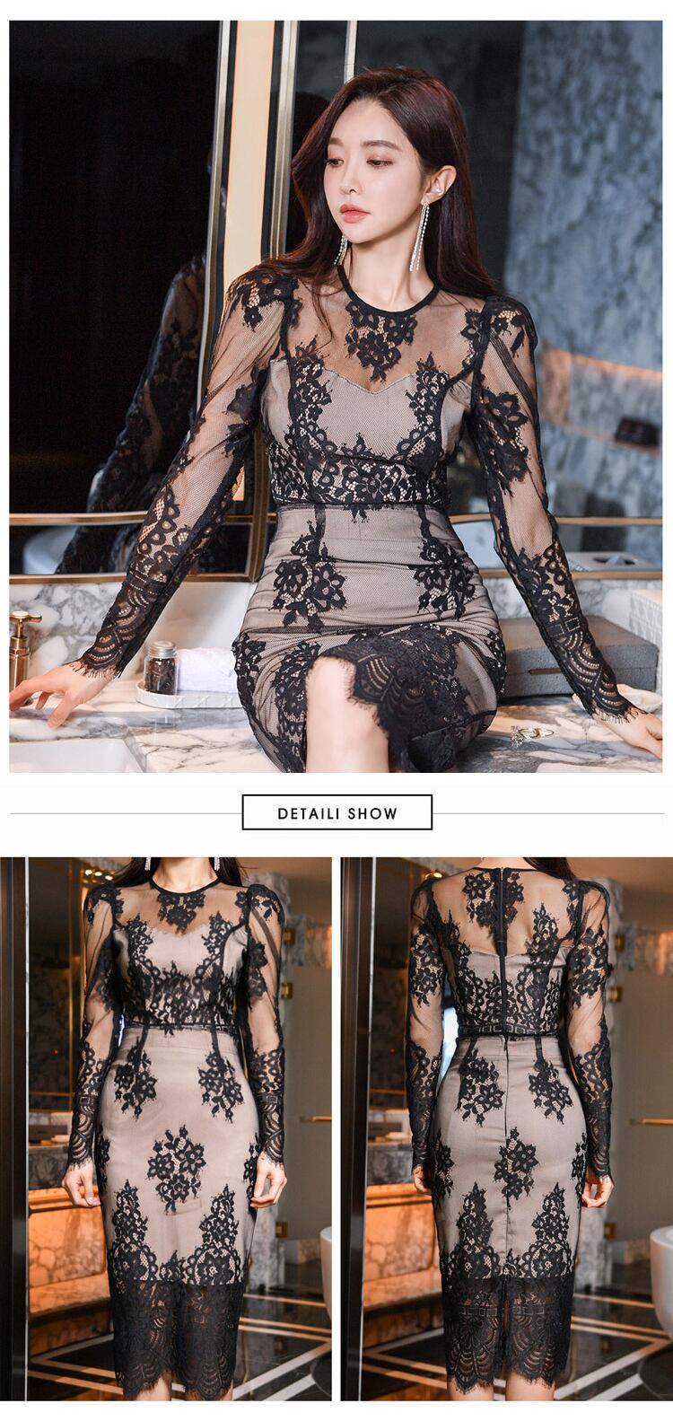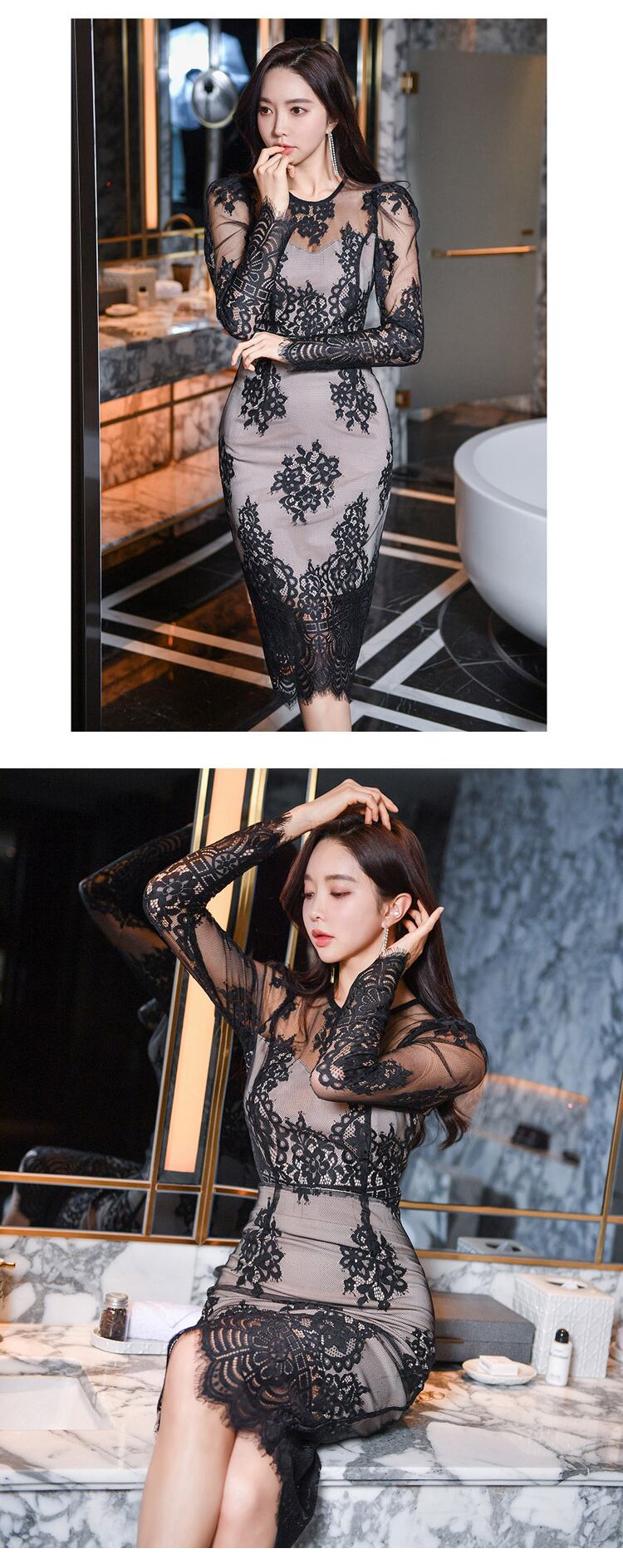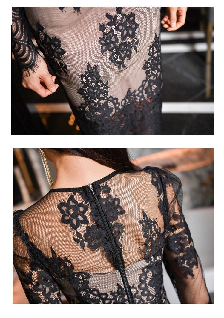 ブラック レトロ レース スカート Oネック スリム MingJieBiHuo63802181405