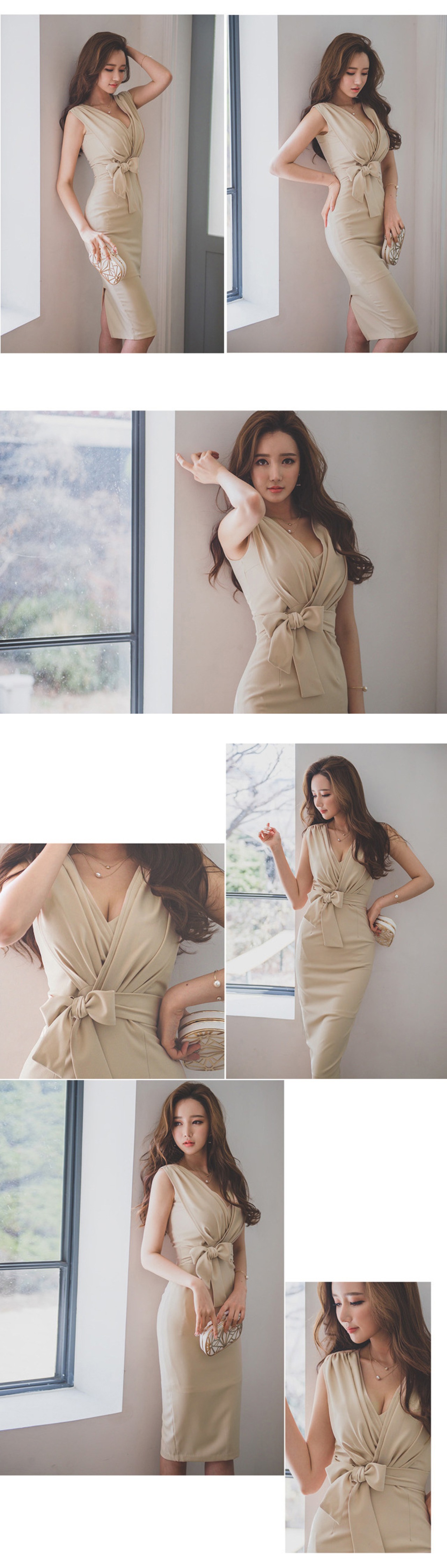 リボン エレガント ノースリーブ Vネック ソリッドカラー MingJieBiHuo5818510232