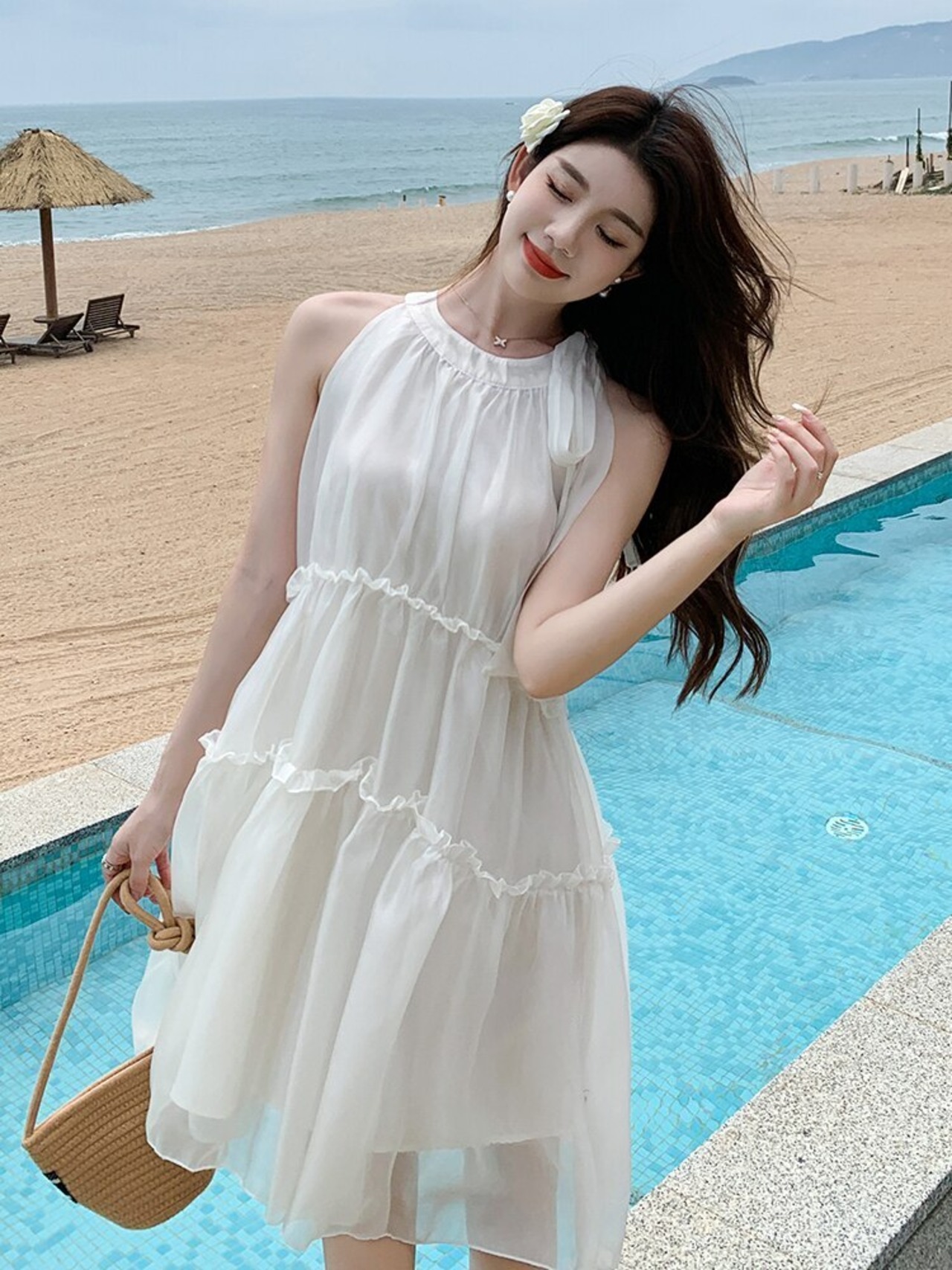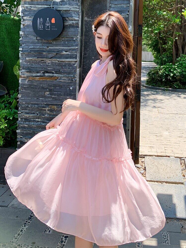 ミニ シフォン 大人ガーリー スウィート キュート カジュアル サマー 夏物 ビーチ ノースリーブ ソリッドカラー MingJieBiHuo87556191149